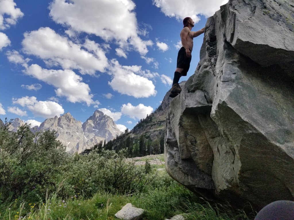 Our third night in North Fork Cascade was also our favorite campsite. We set up camp in the middle of a valley with wildflowers surrounding us, views of the Tetons and several boulders for to climb. After eating dinner that night, Hayden managed to coach me up a boulder and we watched as the sun setting on the Tetons.