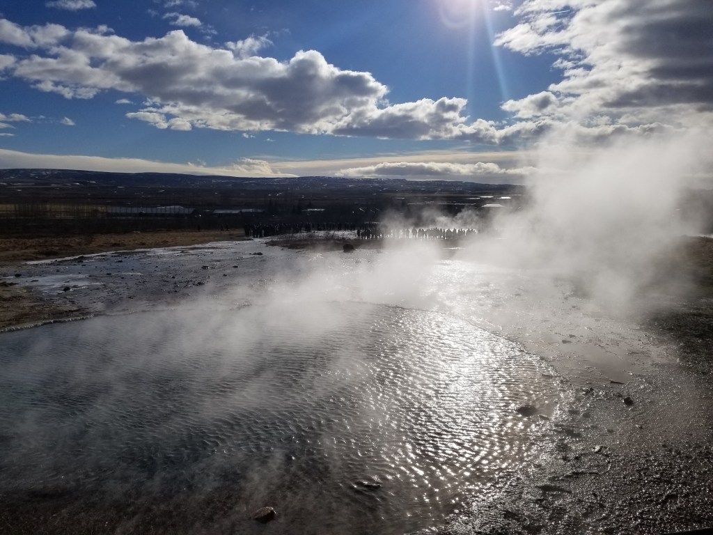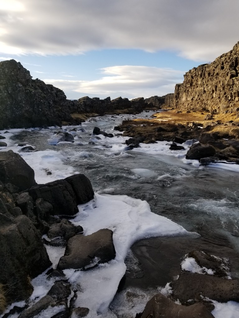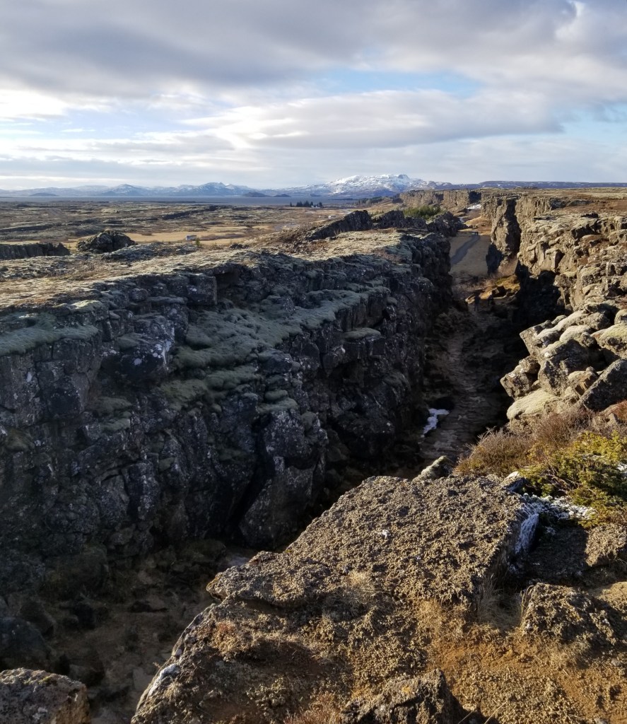 Our next day was a full day tour around the Golden Circle. Our first stop was Thingvellir National Park, also known as the “place where you can walk between two continents.” This is because Thingvellir is home to the fault line between the North American and Eurasian tectonic plates. While some tours offer the ability to snorkel between these plates, since it was still March, we opted for the non-snorkeling tour.