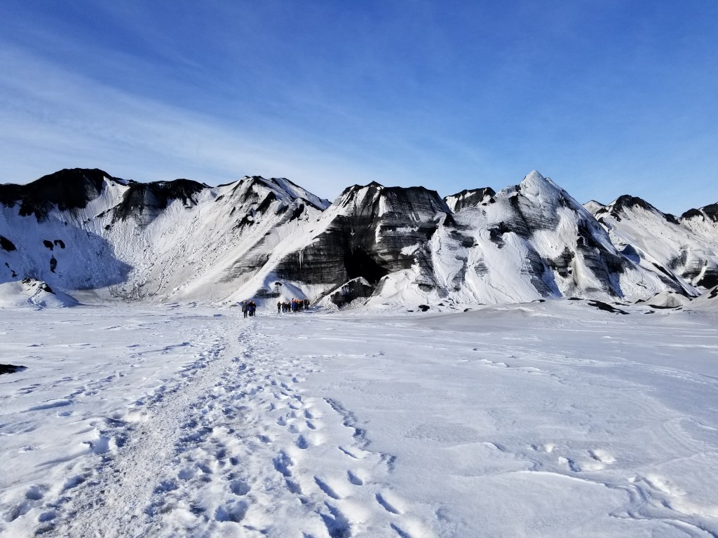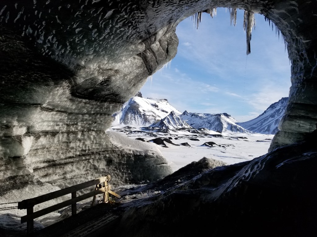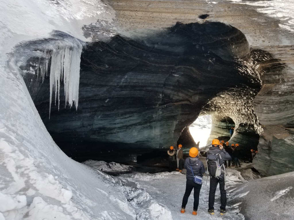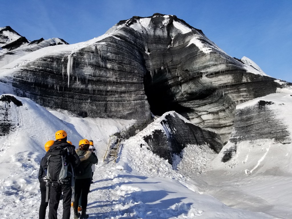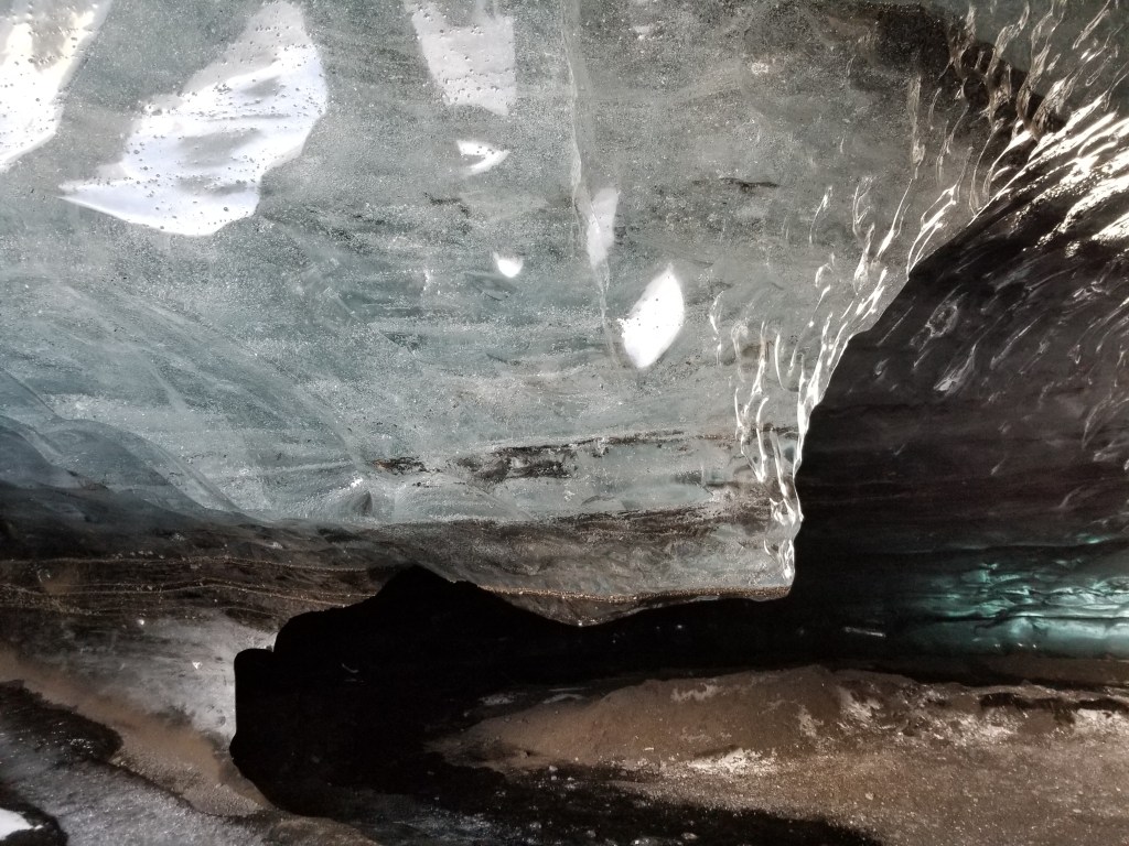 Day 4 was our final tour that consisted of a couple waterfalls and a glacial ice cave. This was an interesting experience. Packed in the back of a van, we endured a 40+ minute bumpy ride out on onto the glacier to arrive at a blackened ice cave. We were instructed to put on helmets and spikes and then we walked the final bit to arrive at the cave. Standing outside the cave, it didn’t look like much, but as you looked more closely, and as the sun would hit the ice in the correct way, the cave transformed into vivid blue and black colors. We were told that this glacier was melting at an alarmingly fast pace, another sign of global climate change.