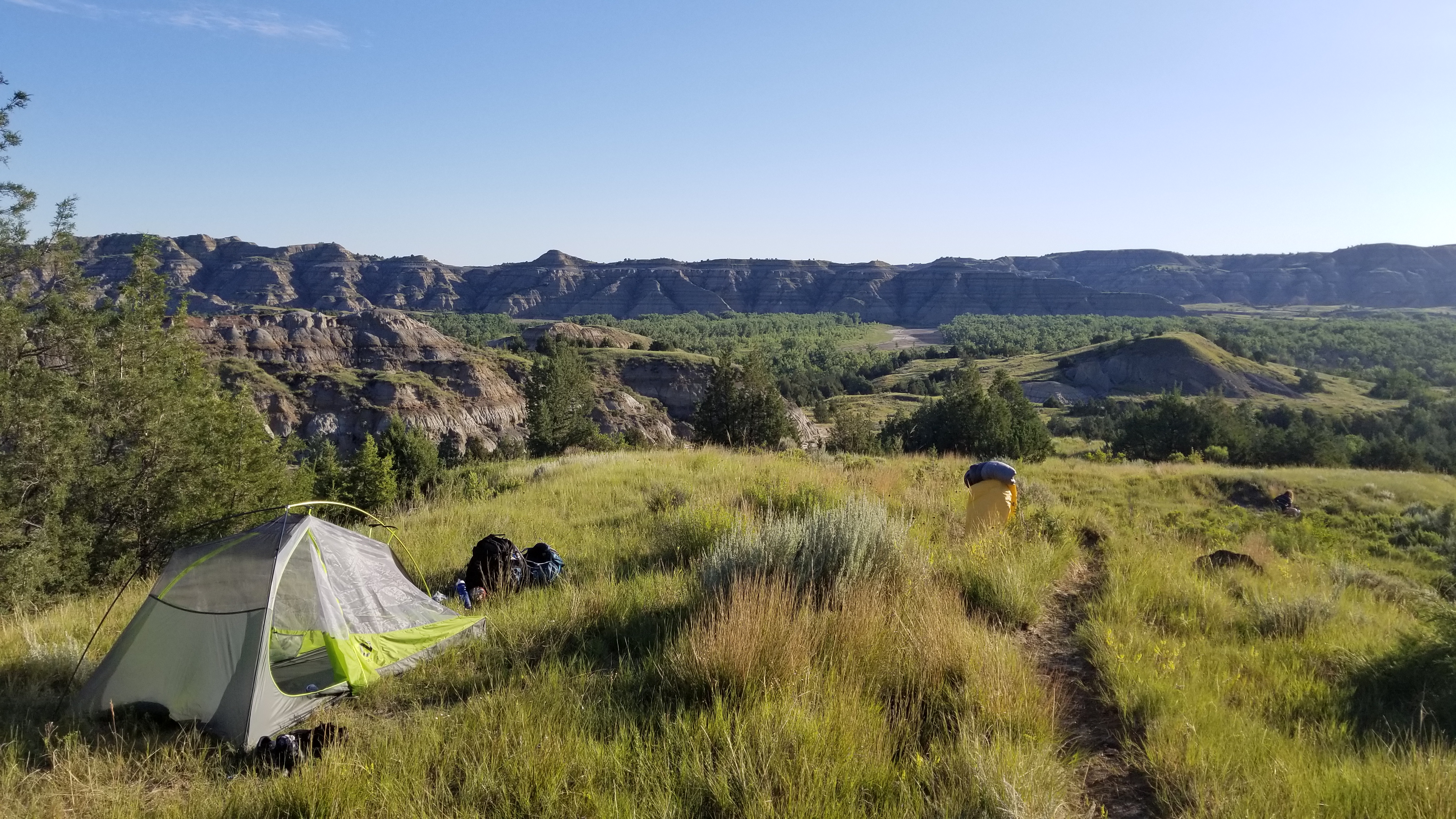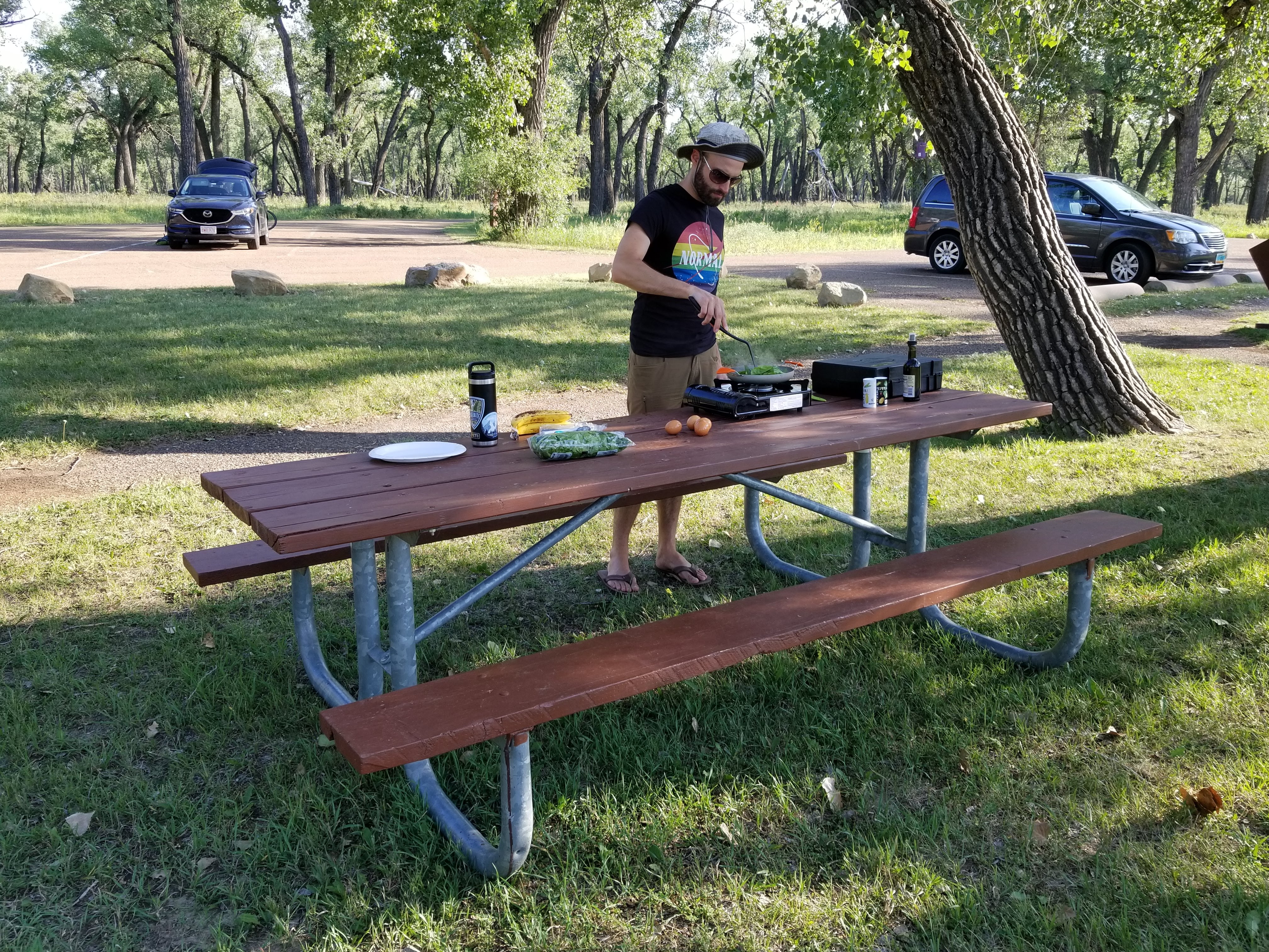 Another half-mile later and we were starting to get desperate to find a spot. We finally found a mediocre spot, with some clear signs that bison had been there, but no bison around at the time. After setting up the tent, and with it starting to get dark, we began to cook dinner a few yards away from camp.