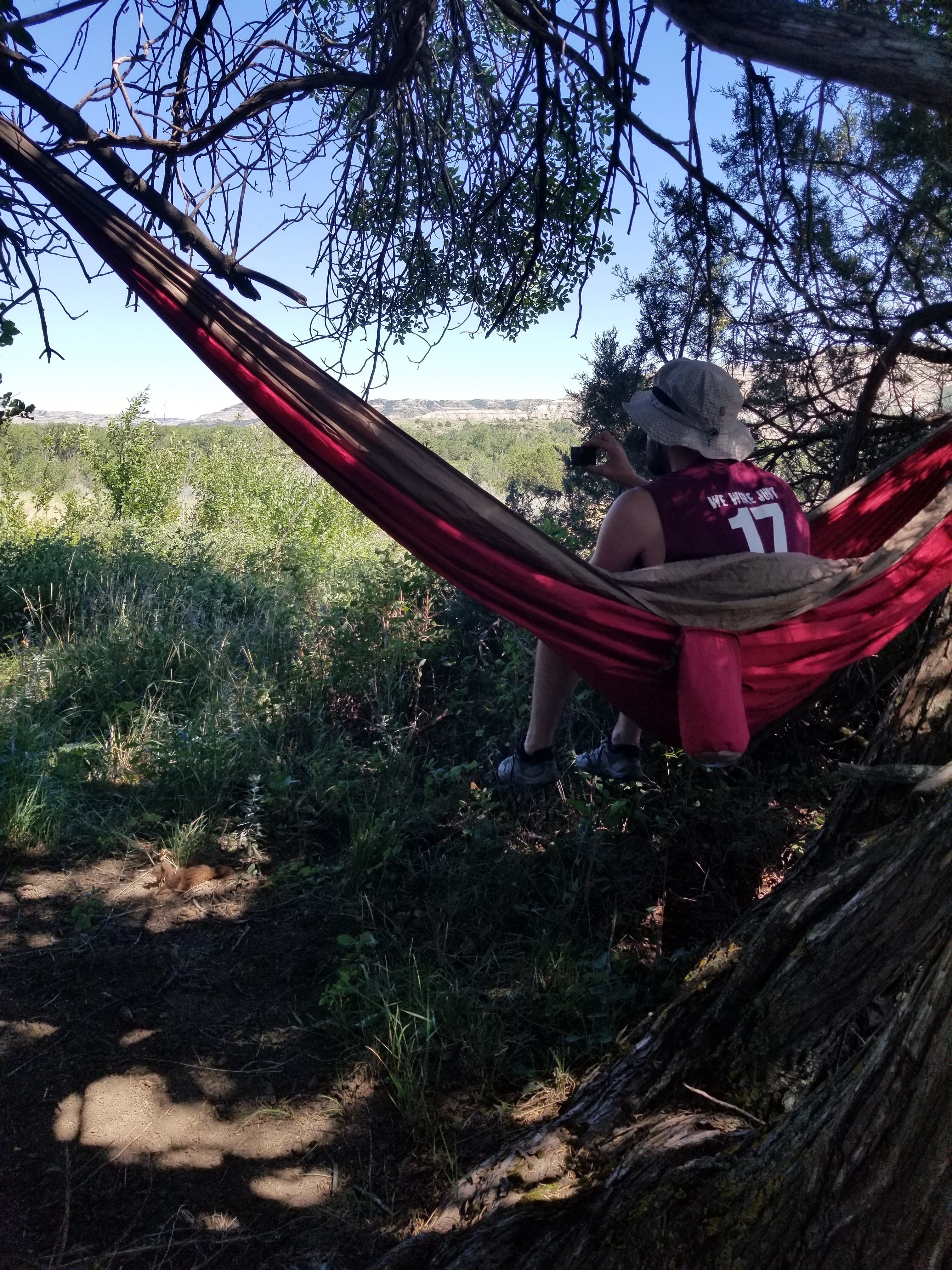 About 7 miles in, just past another river crossing, we found ourselves very lost. After not being able to find a trail marker for almost a mile, Dale said we should take a break and regroup. So we went into what was likely a bison’s home and hung our hammock for an hour. As soon as we packed back up, we were able to find the trail just a little ways away.