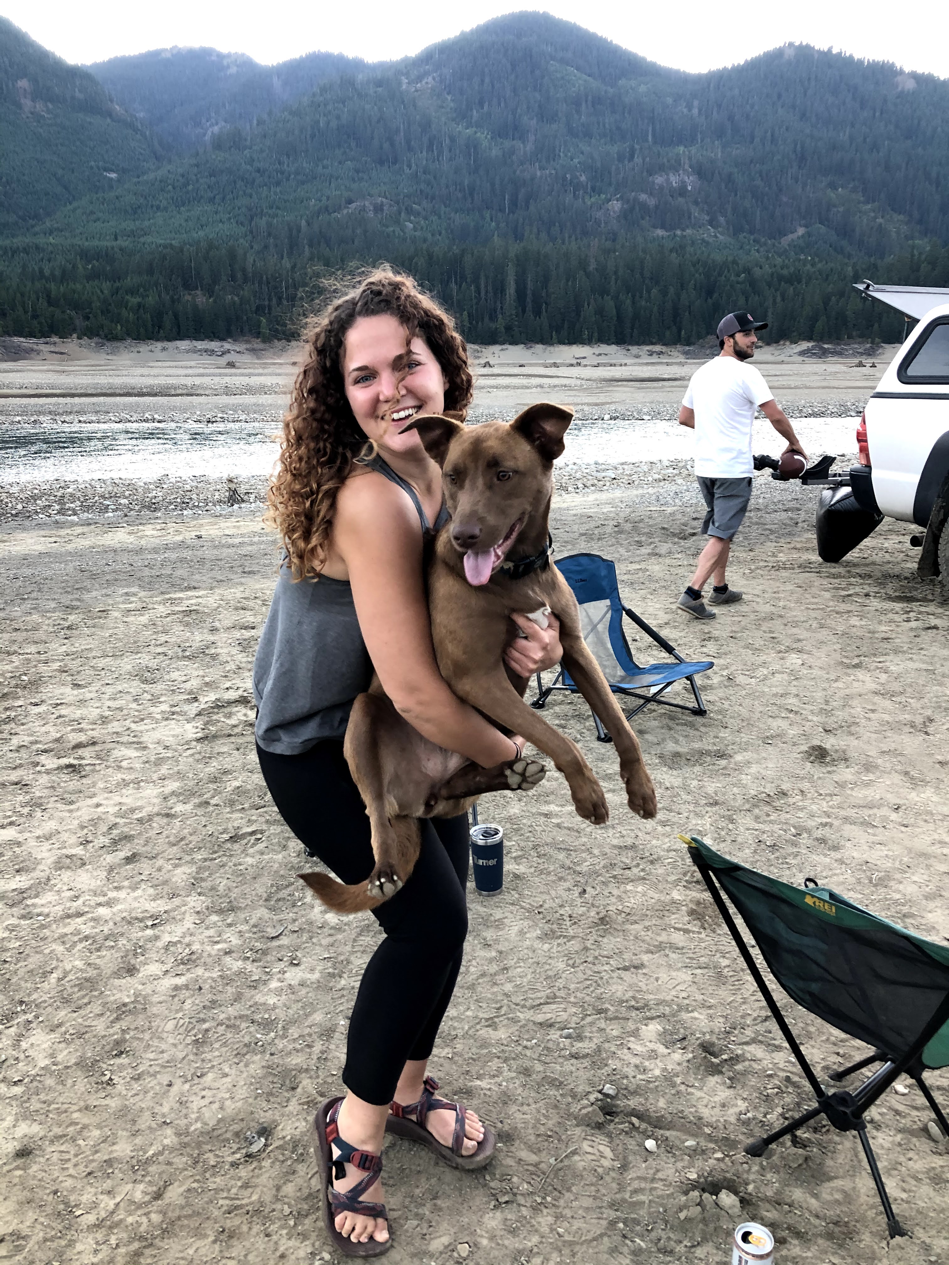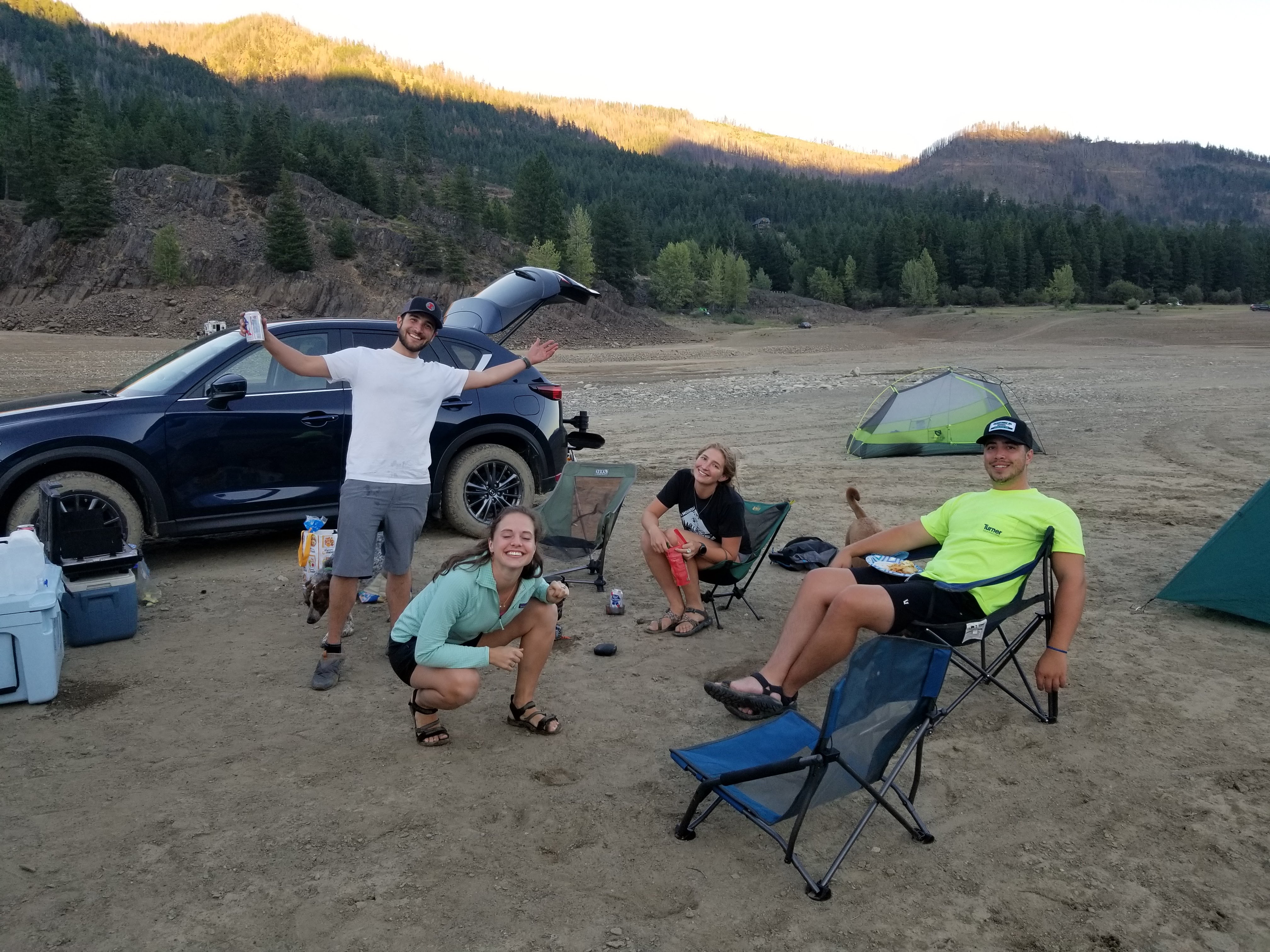 The next weekend, the Seattle crew (Kristen, Graham, Cora and I) decided to meet the Bend crew (Maddie, Ciaran and Harper) in the middle to hike Navaho Peak. The weekend start eventfully, with Graham’s brand new truck getting side swiped causing his mirror to fall off. Needless to say, Graham was not happy that I filled in as driver. We met Maddie and Ciaran at a lake near the start of the trail where you can drive out onto the sand and camp. We caravanned down to the beach, with me in the lead, only for me to get stuck. With the help of everyone pushing, I was able to successfully get unstuck without too much trouble, other than Graham commenting that that wouldn’t have happened if we were in his truck. We setup camp, made dinner, had a fire and tried to coax Cora to swim.