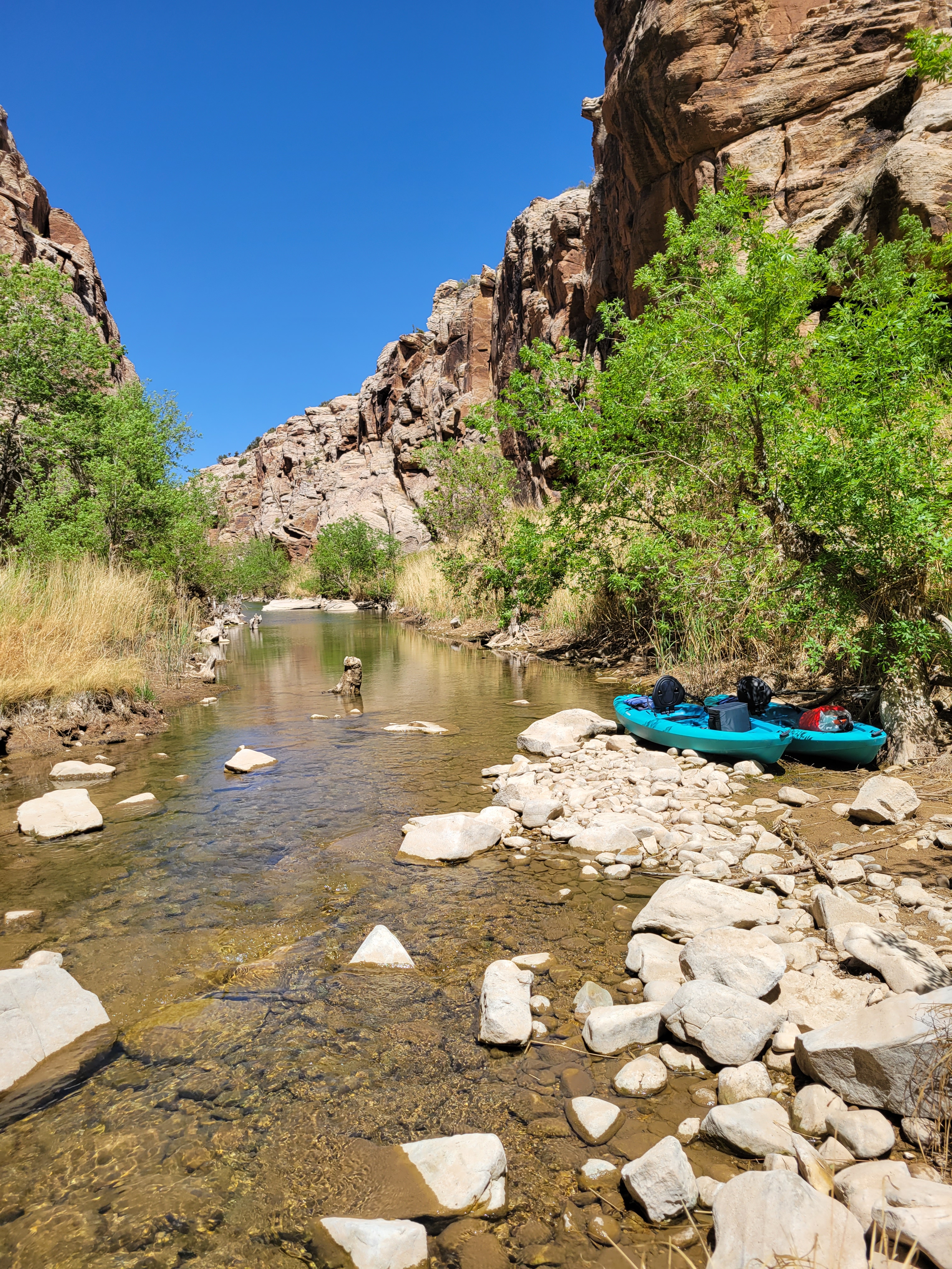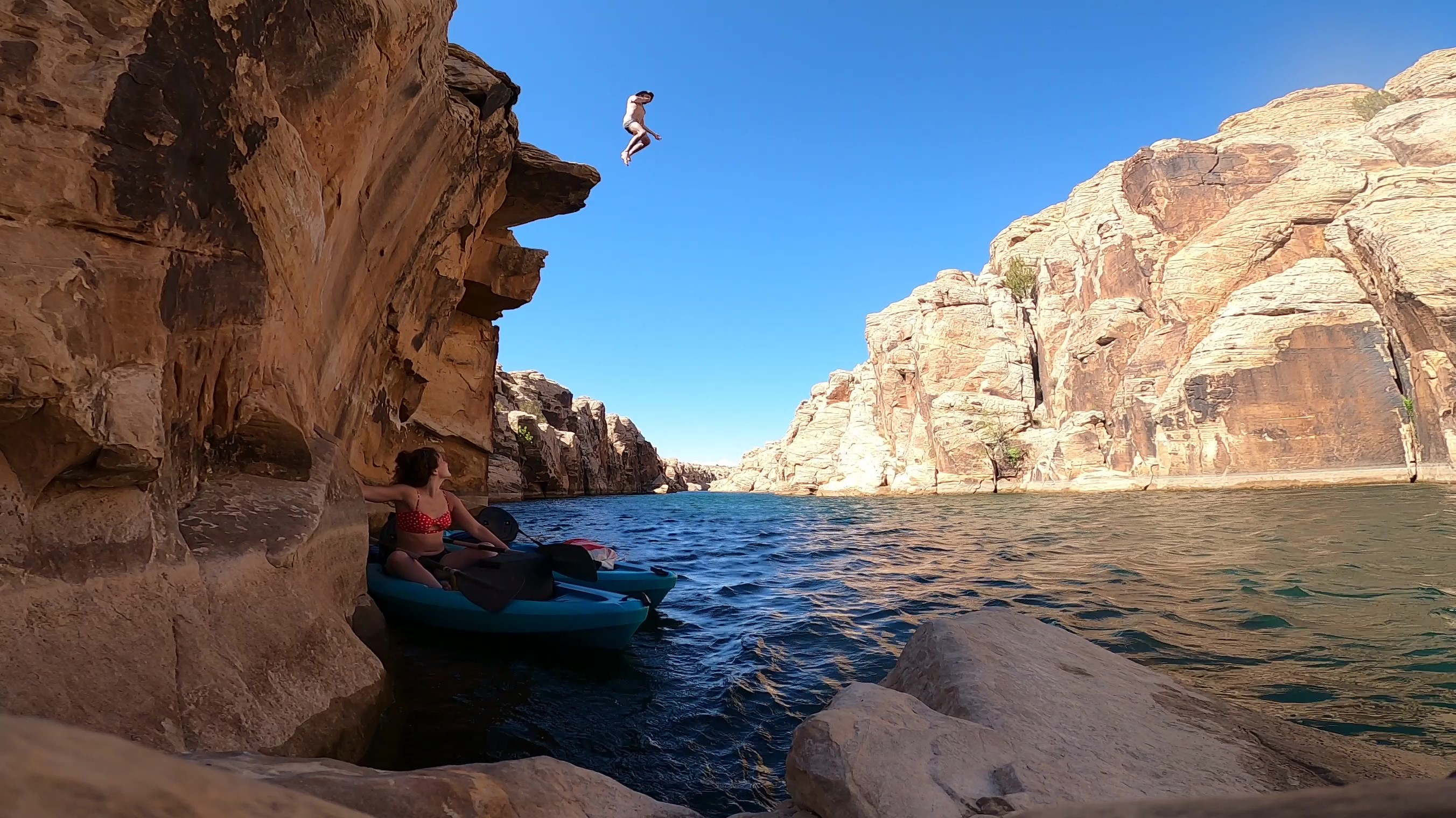 For our last Arizona adventure, Dale and I drove west to Clear Creek where we rented kayaks and paddled through the canyon. We had a beautiful day, the creek was quiet, and best of all there’s no motors allowed on the creek so there was no wake. We paddled all the way to end of the canyon before turning back. On the way back, Dale decided to jump off the edge while I attempted to hold onto both boats.