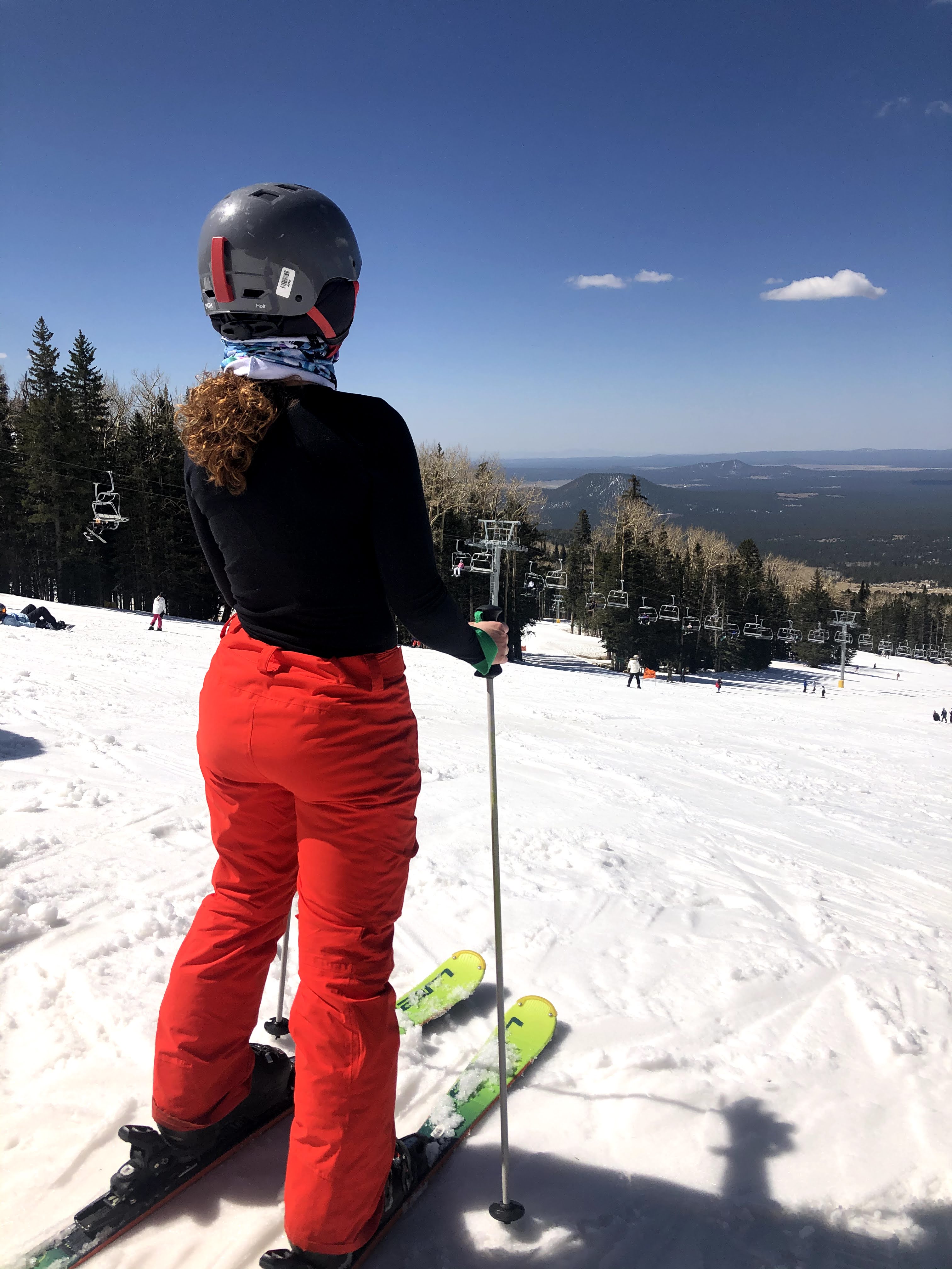 Two days later, we went from wearing sports bras in Sedona to snowpants at the Snowbowl. That’s the nice thing about Flagstaff, you can be in the mountains or desert in an hours drive. That said, it was a 60 degree day in April and nearing the end of the ski season, so by the end of the day we were skiing in long sleeves and no gloves.